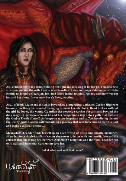 As I cradled her in my arms, holding her tight and refusing to let her go, I made a new vow, renouncing the oath I made as a Guardian. I was no longer a defender of High-Realm, no longer a Guardian, for I had failed in that mission. No, my oath now was for her and her alone. It was now Love's Vow, no other. As all of High-Realm and the lands beyond are plunged into darkness, Carden Highever has only one thing on his mind: bringing Princess Leander back. Heartbroken without the girl he loves, the young Guardian desperately searches for answers beyond the dark magic of necromancers as he and his companions step onto a path that leads to the God of Death himself. As he grows more desperate and suffers horrifying visions fuelled by guilt, Carden will embark on a journey that will force him to face his past and make a difficult choice...Meanwhile, Leander finds herself in an alien world of mists and ghostly memories, alone but for a single familiar face. As she comes to terms with her untimely death and the concept that she is trapped between Azmerath's Kingdom and the Void, Leander can only wait and hope that Carden can save her. But at what cost will that come?