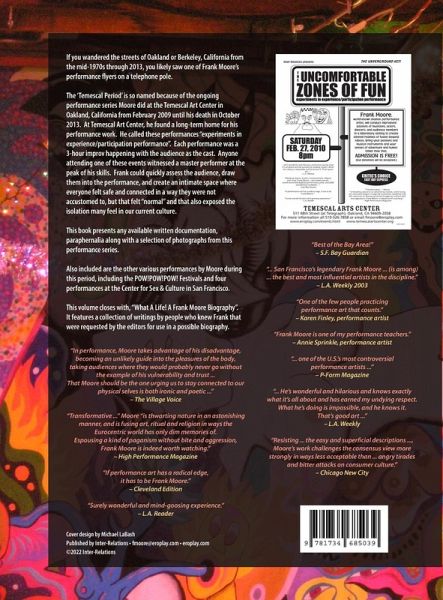 If you wandered the streets of Oakland or Berkeley, California from the mid-1970s through 2013, you likely saw one of Frank Moore's performance flyers on a telephone pole. The Temescal period is so named because of the ongoing performance series Moore did at the Temescal Art Center in Oakland, California from 2009 until his death in October 2013. At Temescal Art Center, he found a long-term home for his performance work. He called these performances "experiments in experience/participation performance". Each performance was a 3-hour improv happening with the audience as the cast. Anyone attending one of these events witnessed a master performer at the peak of his skills. Frank could quickly assess the audience, draw them into the performance, and create an intimate space where everyone felt safe and connected in a way they were not accustomed to, but that felt "normal" and that also exposed the isolation many feel in our current culture. This book presents any available written documentation, paraphernalia along with a selection of photographs from this performance series. Also included are the other various performances by Moore during this period, including the POW!POW!POW! Festivals and four performances at the Center for Sex & Culture in San Francisco. This volume closes with, "What A Life! A Frank Moore Biography". It features a collection of writings by people who knew Frank that were requested by the editors for use in a possible biography.