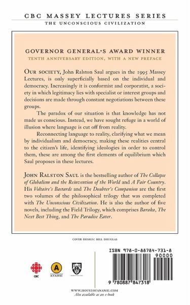 Governor General's Award Winner Tenth Anniverary Edition, with a new preface Our society, John Ralston Saul argues in his 1995 CBC Massey Lectures, is only superficially based on the individual and democracy. Increasingly it is conformist and corporatist, a society in which legitimacy lies with specialist or interest groups and decisions are made through constant negotiations between these groups. The paradox of our situation is that knowledge has not made us conscious. Instead, we have sought refuge in a world of illusion where language is cut off from reality. Reconnecting language to reality, clarifying what we mean by individualism and democracy, making these realities central to the citizen's life, identifying ideologies in order to control them, these are among the first elements of equilibrium which Saul proposes in these lectures. John Ralston Saul argues that our society is only superficially based on democracy, and that increasingly it is conformist and corporatist.