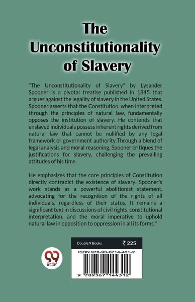 ""The Unconstitutionality of Slavery"" by Lysander Spooner is a pivotal treatise published in 1845 that argues against the legality of slavery in the United States. Spooner asserts that the Constitution, when interpreted through the principles of natural law, fundamentally opposes the institution of slavery. He contends that enslaved individuals possess inherent rights derived from natural law that cannot be nullified by any legal framework or government authority. Through a blend of legal analysis and moral reasoning, Spooner critiques the justifications for slavery, challenging the prevailing attitudes of his time. He emphasizes that the core principles of Constitution directly contradict the existence of slavery. Spooner's work stands as a powerful abolitionist statement, advocating for the recognition of the rights of all individuals, regardless of their status. It remains a significant text in discussions of civil rights, constitutional interpretation, and the moral imperative to uphold natural law in opposition to oppression in all its forms.