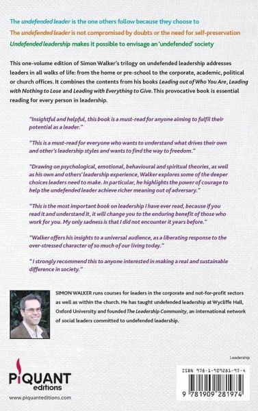 This one-volume edition of Simon Walker's trilogy of books on 'undefended' leadership addresses leaders in all walks of life: from the home or pre-school to the corporate, academic, political or church offices. It combines the contents from his books: Leading out of Who You Are; Leading with Nothing to Lose; Leading with Everything to Give. In the first book he examines the formation of the leadership ego and shows how maintaining a front and back stage derails leaders. In the second book Simon looks at how power is used in leadership, based on eight case studies from history, and draws powerful guidelines for leaders today. In the final book he focuses on the leader's vision and examines what has caused the current failure of leadership in the West. He points out the direction in which we need to move if life is to flourish in the coming decades.