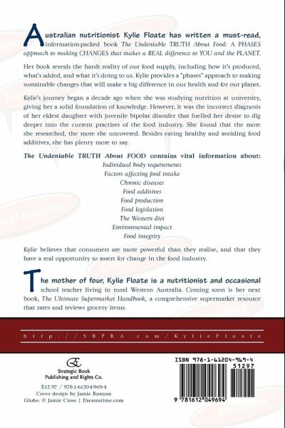 Australian nutritionist Kylie Floate has written a must-read, information-packed book The Undeniable TRUTH About Food: A PHASES approach to making CHANGES that makes a REAL difference to YOU and the PLANET. Her book reveals the harsh reality of our food supply, including how it's produced, what's added, and what it's doing to us. Kylie provides a "phases" approach to making sustainable changes that will make a big difference in our health and for our planet. Kylie's journey began a decade ago when she was studying nutrition at university, giving her a solid foundation of knowledge. However, it was the incorrect diagnosis of her eldest daughter with juvenile bipolar disorder that fuelled her desire to dig deeper into the current practises of the food industry. She found that the more she researched, the more she uncovered. Besides eating healthy and avoiding food additives, she has plenty more to say. The Undeniable TRUTH About FOOD contains vital information about: individual body requirements; factors affecting food intake; chronic diseases; food additives; food production; food legislation; the Western diet; environmental impact; food integrity. Kylie believes that consumers are more powerful than they realise, and that they have a real opportunity to assert for change in the food industry. The mother of four, Kylie Floate is a nutritionist and occasional school teacher living in rural Western Australia. Coming soon is her next book, The Ultimate Supermarket Handbook, a comprehensive supermarket resource that rates and reviews grocery items.
