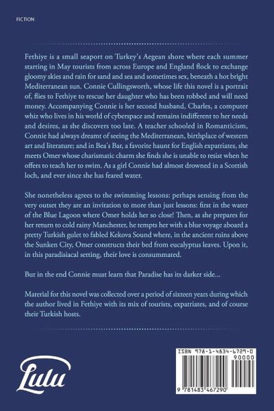 Fethiye is a small seaport on Turkey's Aegean shore where each summer starting in May tourists from across Europe and England flock to exchange gloomy skies and rain for sand and sea and sometimes sex, beneath a hot bright Mediterranean sun. Connie Cullingsworth, whose life this novel is a portrait of, flies to Fethiye to rescue her daughter who has been robbed and will need money. Accompanying Connie is her second husband, Charles, a computer whiz who lives in his world of cyberspace and remains indifferent to her needs and desires, as she discovers too late. A teacher schooled in Romanticism, Connie had always dreamt of seeing the Mediterranean, birthplace of western art and literature; and in Bea's Bar, she meets Omer whose charismatic charm she finds she is unable to resist when he offers to teach her to swim. As a girl Connie had almost drowned in a Scottish loch, and ever since she has feared water. But in the end Connie must learn that Paradise has its darker side