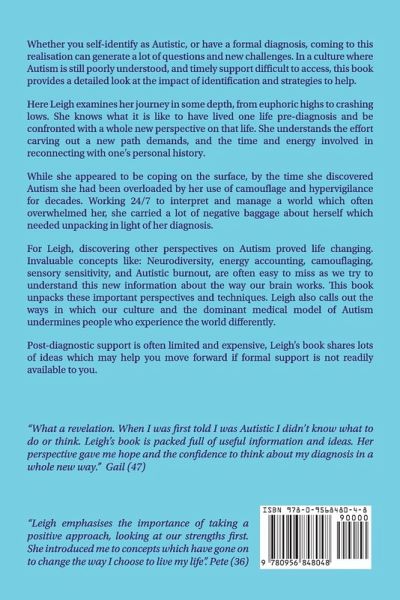 Whether you self-identify as Autistic, or have a formal diagnosis, coming to this realisation can generate a lot of questions and new challenges. In a culture where Autism is still poorly understood, and timely support difficult to access, this book provides a detailed look at the impact of identification and strategies to help. Here Leigh examines her journey in some depth, from euphoric highs to crashing lows. She knows what it is like to have lived one life pre-diagnosis and be confronted with a whole new perspective on that life. She understands the effort carving out a new path demands, and the time and energy involved in reconnecting with one's personal history. While she appeared to be coping on the surface, by the time she discovered Autism she had been overloaded by her use of camouflage and hypervigilance for decades. Working 24/7 to interpret and manage a world which often overwhelmed her, she carried a lot of negative baggage about herself which needed unpacking in light of her diagnosis. For Leigh, discovering other perspectives on Autism proved life changing. Invaluable concepts like: Neurodiversity, energy accounting, camouflaging, sensory sensitivity, and Autistic burnout, are often easy to miss as we try to understand this new information about the way our brain works. This book unpacks these important perspectives and techniques. Leigh also calls out the ways in which our culture and the dominant medical model of Autism undermines people who experience the world differently. Post-diagnostic support is often limited and expensive, Leigh's book shares lots of ideas which may help you move forward if formal support is not readily available to you. "What a revelation. When I was first told I was Autistic I didn't know what to do or think. Leigh's book is packed full of useful information and ideas. Her perspective gave me hope and the confidence to think about my diagnosis in a whole new way." Gail (47) "Leigh emphasises the importance of taking a positive approach, looking at our strengths first. She introduced me to concepts which have gone on to change the way I choose to live my life". Pete (36)