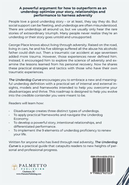 A powerful argument for how to outperform as an underdog: optimize your story, relationships and performance to harness adversity. People love a good underdog story - or at least, they say they do. But social support can be fleeting, and underdogs are often misunderstood. There are underdogs all around us, but we usually only hear the rare stories of extraordinary triumph. Many people never realize they're an underdog or their story goes untold and unsupported. George Place knows about living through adversity. Raised on the road, living in cars, he and his five siblings suffered all the abuse his alcoholic father could dish out. Then a traumatic car accident at age seventeen added more trauma. However, those experiences never defined him. Instead, it encouraged him to explore the science of adversity and examine the lessons learned from his personal recovery. Now he shares these practical strategies and tactics with those who have their own traumatic experiences. The Underdog Curve encourages you to embrace a new and meaningful underdog definition with a practical set of internal and external in-sights, models and frameworks intended to help you overcome your disadvantages and thrive. This roadmap is designed to help you evolve into the credible contender you were meant to be. Readers will learn how: - Disadvantage creates three distinct types of underdogs. - To apply practical frameworks and navigate the Underdog Economy. - To develop a powerful story, intentional relationships, and differentiated performance. - To implement the 9 elements of underdog proficiency to renew your life. Written for anyone who has lived through real adversity, The Underdog Curve is a practical guide that catapults readers to new heights of personal and professional progress.