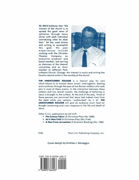 The Undisturbed Soldier is a chancel play for Lent that allows us to witness Jesus' arrest, interrogation, beating, and crucifixion through the eyes of two Roman soldiers who took part in most of these events. In the interaction between these soldiers and two Jewish women, the challenge of believing in Jesus is brought to the surface. At the end of the play, three of these persons are convinced that Jesus had indeed risen from the dead while one remains "undisturbed" by it all. The Undisturbed Soldier will give an audience much food for thought concerning one's own response to the life and death of Jesus. Ed Irsch believes that "the mission of the church is to spread the good news of salvation through Jesus Christ with each individual contributing what he does best." Ed has used drama and writing to accomplish this goal. His past experiences include working with the Christian Theater Company as executive producer and board member and serving as chairman of the chancel committee and as choir member at Jefferson Park Lutheran Church, Chicago. His interest in music and writing has found a natural outlet in the worship of the church.