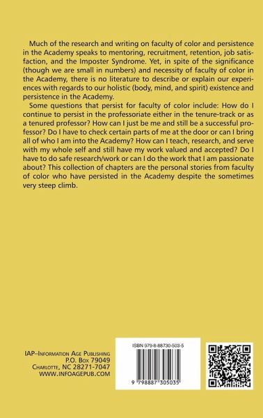 Much of the research and writing on faculty of color and persistence in the Academy speaks to mentoring, recruitment, retention, job satisfaction, and the Imposter Syndrome. Yet, in spite of the significance (though we are small in numbers) and necessity of faculty of color in the Academy, there is no literature to describe or explain our experiences with regards to our holistic (body, mind, and spirit) existence and persistence in the Academy. Some questions that persist for faculty of color include: How do I continue to persist in the professoriate either in the tenure-track or as a tenured professor? How can I just be me and still be a successful professor? Do I have to check certain parts of me at the door or can I bring all of who I am into the Academy? How can I teach, research, and serve with my whole self and still have my work valued and accepted? Do I have to do safe research/work or can I do the work that I am passionate about? This collection of chapters are the personal stories from faculty of color who have persisted in the Academy despite the sometimes very steep climb.
