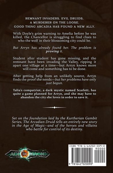 Remnant invaders. Evil druids. A murderer on the loose. Good thing Arcadia has found a new ally. With Doyle's grim warning to Amelia before he was killed, the Chancellor is struggling to find clues to who the wolf in their blossoming city could be. But Arryn has already found her. The problem is proving it. Student after student has gone missing, and the remnant have been invading the Valley, ripping it apart one village at a time-but Arryn knows more will come and something has to be done. After getting help from an unlikely source, Arryn finds the proof she needs-but her problems have only just begun. Talia's compatriot, a dark mystic named Scarlett, has quite a game planned for Arryn, and she may have to abandon the city she loves in order to save it. Set on the foundation laid by the Kurtherian Gambit Series, The Arcadian Druid tells an entirely new story in the Age of Magic--and of the heroes and villains who battle for control of its destiny.
