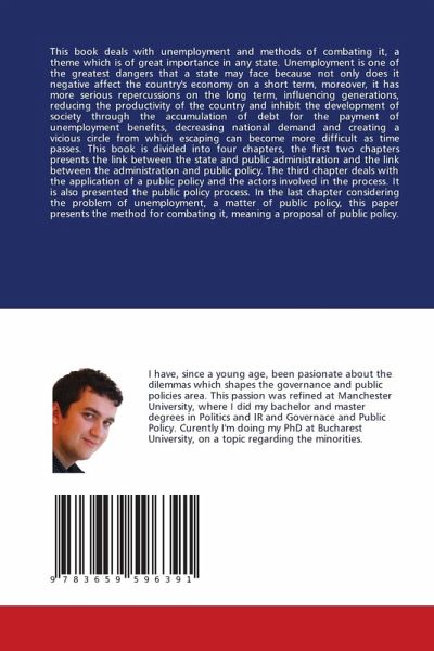 This book deals with unemployment and methods of combating it, a theme which is of great importance in any state. Unemployment is one of the greatest dangers that a state may face because not only does it negative affect the country's economy on a short term, moreover, it has more serious repercussions on the long term, influencing generations, reducing the productivity of the country and inhibit the development of society through the accumulation of debt for the payment of unemployment benefits, decreasing national demand and creating a vicious circle from which escaping can become more difficult as time passes. This book is divided into four chapters, the first two chapters presents the link between the state and public administration and the link between the administration and public policy. The third chapter deals with the application of a public policy and the actors involved in the process. It is also presented the public policy process. In the last chapter considering the problem of unemployment, a matter of public policy, this paper presents the method for combating it, meaning a proposal of public policy.
