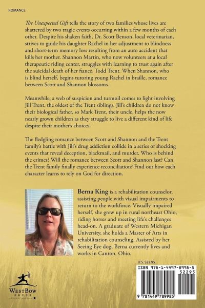 The Unexpected Gift tells the story of two families whose lives are shattered by two tragic events occurring within a few months of each other. Despite his shaken faith, Dr. Scott Benson, local veterinarian, strives to guide his daughter Rachel in her adjustment to blindness and short-term memory loss resulting from an auto accident that kills her mother. Shannon Martin, who now volunteers at a local therapeutic riding center, struggles with learning to trust again after the suicidal death of her fiancé, Todd Trent. When Shannon, who is blind herself, begins tutoring young Rachel in braille, romance between Scott and Shannon blossoms. Meanwhile, a web of suspicion and turmoil comes to light involving Jill Trent, the oldest of the Trent siblings. Jill's children do not know their biological father, so Mark Trent, their uncle, helps the now nearly grown children as they struggle to live a different kind of life despite their mother's choices. The fledgling romance between Scott and Shannon and the Trent family's battle with Jill's drug addiction collide in a series of shocking events that reveal deception, blackmail, and murder. Who is behind the crimes? Will the romance between Scott and Shannon last? Can the Trent family finally experience reconciliation? Find out how each character learns to rely on God for direction.