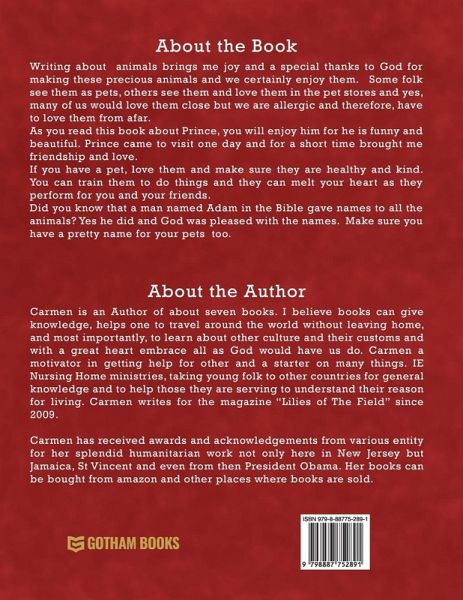 Writing about animals brings me joy and a special thanks to God for making these prescious animals and we certainly enjoy them. Some folk see them as pets, others see them and love them in the pet stores and yes, amny of us would love them close but we are allergic and therefore, have to love them from afar. As you read this book about Prince, you will enjoy him for he is funny and beautiful. Prince came to visit one day and for a short time brought me friendship and love. If you have a pet, love them and make sure they are helathy and kind. You can train them to do things and they can melt your heart as they perform for you and your friends. Did you know that a man named Adam in the Bible gave names to all the animals? Yes he did and God was pleased with the names. Make sure you have a pretty name for your pets too.