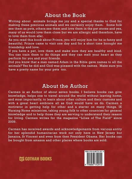 Writing about animals brings me joy and a special thanks to God for making these prescious animals and we certainly enjoy them. Some folk see them as pets, others see them and love them in the pet stores and yes, amny of us would love them close but we are allergic and therefore, have to love them from afar. As you read this book about Prince, you will enjoy him for he is funny and beautiful. Prince came to visit one day and for a short time brought me friendship and love. If you have a pet, love them and make sure they are helathy and kind. You can train them to do things and they can melt your heart as they perform for you and your friends. Did you know that a man named Adam in the Bible gave names to all the animals? Yes he did and God was pleased with the names. Make sure you have a pretty name for your pets too.