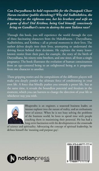 Can Duryodhana be held responsible for the Draupadi Cheer Haran incident (public disrobing)? Why did Yudhishthira, the Dharmraj or the righteous one, bet his brothers and wife on a game of dice? Did Krishna, being God himself, consciously bring on Gandhari's curse to destroy his own Yadava race? Through this book, you will experience the world through the eyes of three fascinating characters from the Mahabharata - Duryodhana, Yudhishthira, and Krishna - all at pivotal moments in their lives. The author delves deeply into their lives, attempting to understand the driving forces behind their decisions. He explores the many lesser known stories from their past, for example, the story of the birth of Duryodhana, his ninety-nine brothers, and one sister, all from a single pregnancy. The book illustrates the evolution of human consciousness from an ego-centered being to an enlightened being as it progresses from one character to another. These gripping stories and the compulsions of the different players will make you deeply ponder the ultimate force of conditioning in your own life. A force that blindly pushes you towards a preset life, but at the same time, it reveals the boundless potential and freedom in the moment, which you can harness to change the direction of your life in whichever way you wish.