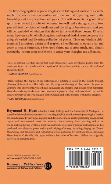 This little congregation of poems begins with fishing and ends with a candle snuffer. Between come encounters with fear and faith, parting and death, friendship and love, dejection and peace. You will encounter a good bit of spiritual sense and just a bit of nonsense. You will read a strange story or two, you will feel the clutch of loneliness and the sting of bereavement, and you will be reminded of wisdom that shines far beyond these poems. Rhymed verse, free verse, a bit of rollicking fun, and a good deal of heart compose this uniquely varied and diverting collection of poems. Time and birds, a chipmunk and a squirrel, daisies and maples, a bloodhound, a zipper, a jar and cover, a nest, a buttercup, a bier, used shirts, tea, a cross stitch, and, almost inevitably, the sun come one by one to entice your thoughts and affections.