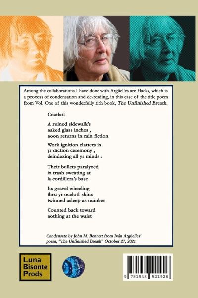 Iván Argüelles is clearly one of the most unique and authentic poets working in English today, and I dare say one of the most authentic in any language. His uniquely identifiable voice runs throughout his work, but each of his individual books and poems has its own unique timbre, point of view, its own movement, tone, thematic center. Each work is unique. The nature of his engagement over the past 50 years or so has been far more than a desire to write "poetry", rather, poetry is the air he breathes to embody a complex psychic need, the air he needs to be in the life form and time he occupies. When you consider Iván Argüelles' work, you are not looking at a literary career, but at something basic about the being of living things in general. Proof of this is that the intense late poems in this book (Vol. Two written May 2, 2022 to Nov. 20, 2022) are stronger than ever. His work is one of our greatest treasures. -John M. Bennett
