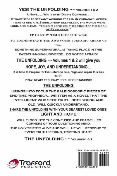 The UNFOLDING Volume I reveals in novel form what many have longed to know. This is the generation that will see the fulfillment of events prophesied in this book. The UNFOLDING is a must read for you if you want the truth regardless of your personal prejudices. Whether you respect the ancient prophecies of scripture or not, you owe it to yourself to know what you may be ignoring. The Revelation is clearly for this age, and will impact all living. This is your chance to discover its relevance. At this moment in history, the scenario depicted here is unfolding with ever-increasing rapidity. It is the book of Revelation that The UNFOLDING brings into modern focus. It reads like today's newspaper, and is front and center on the stage of prophetic fulfillment, as the world hurtles toward it's appointed destiny-a showdown with its Creator! We can no longer pretend that these writings are the ramblings of a crazy person. They are unfolding before our eyes. In concert with multiple contextual scriptures verifying the truth of the Revelation, The UNFOLDING brings the news into focus to reveal the signs of the times. These signs include: World-wide financial, political, religious and racial upheavals. A frantic search for UNITY-One World Government System, benevolent at first, then ruled by a "Leader" without scruples Increasing antagonism against the Jew and Israel The elements of earth itself growing increasingly restless, spawning earthquakes, tsunamis and destructive weather worldwide. Microchip implants in humans Increasing hate directed at the Crucified One and His followers Planned extinction of all believers and political dissidents Expect an exciting, unusual, mind-gripping adventure as you read The UNFOLDING. Volume I brings hope into the turmoil and light into heavy darkness. Be both challenged and blessed. Discover PEACE!