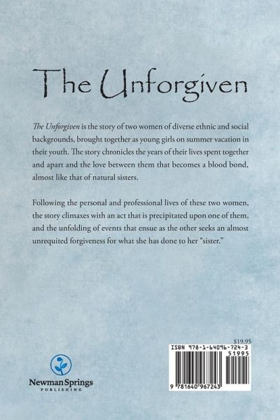 The Unforgiven is the story of two women who meet in their childhood, spend their lives together, and in an act that takes place, it forever changes the course of their lives and people in it. The story embodying the manuscript is the depiction of two young women of diverse ethnic and social backgrounds, brought together as young girls on summer vacation in their youth. The story chronicles the years of their lives spent together and apart and the love between them that becomes a blood bond, almost like that of natural sisters. Following the personal and professional lives of these two women, the story climaxes with an act that is precipitated upon one of them, and the unfolding of events that ensue as the other seeks an almost unrequited forgiveness for what she has done to her "sister."