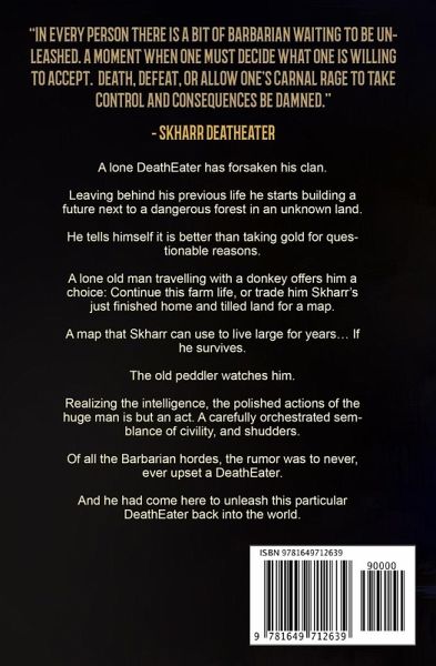 "In every person there is a bit of barbarian waiting to be unleashed. A moment when one must decide what one is willing to accept. Death, defeat, or allow one's carnal rage to take control and consequences be damned." Skharr DeathEater A lone DeathEater has forsaken his clan. Leaving behind his previous life he starts building a future next to a dangerous forest in an unknown land. He tells himself it is better than taking gold for questionable reasons. A lone old man travelling with a donkey offers him a choice: Continue this farm life, or trade him Skharr's just finished home and tilled land for a map. A map that Skharr can use to live large for years... If he survives. The old peddler watches him. Realizing the intelligence, the polished actions of the huge man is but an act. A carefully orchestrated semblance of civility, and shudders. Of all the Barbarian hordes, the rumor was to never, ever upset a DeathEater. And he had come here to unleash this particular DeathEater back into the world. Go up and click 'Read for Free' or 'Buy Now' and begin the journey of Skharr DeathEater - The Unforgiven.