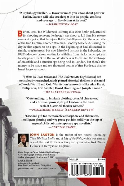 Berlin, 1963. East End-Londoner turned spy Joe Wilderness has had better days. He is sitting in a West Berlin jail, arrested for shooting someone he thought was about to kill him. His old boss, Lieutenant Burne-Jones of MI6, comes to Berlin to free him, but only under the condition that he rejoin British Intelligence. The knowledge that Wilderness gained of Berlin’s underworld while working the black market just after World War II will prove useful to Queen and country now that the city has become the epicenter of the Cold War, dividing the world in two with its wall. On the other side of the Iron Curtain, another MI6 man, Geoffrey Masefield, is ruing the day he first agreed to be a spy. In the beginning, it had all seemed so simple, so glamorous: the international travel, the top secret files, the vodka, the women. . . . But now Masefield is stuck in Lubyanka, the KGB’s Moscow prison, waiting for a lifeline from his former employer. Meanwhile, over in England, a Russian spy is pining for his homeland. Having lived as Bernard Forbes Campbell Alleyn for years and taken a wife and had two daughters under that alias, he’s now been exposed as KGB Captain Leonid Liubimov. Arrested for treason and then for espionage, he is in prison at Wormwood Scrubs, London. The only ticket out for these two men is a spy exchange. Posted back to Berlin, Wilderness is to oversee the exchange of Masefield and Liubimov, but his black market nous hasn’t diminished. There’s money to be made and ten thousand bottles of fine Bordeaux that Wilderness hasn’t forgotten about. A brilliantly evocative novel from a writer regularly compared to John le Carré, The Unfortunate Englishman is a gripping tale of Cold War espionage, and the best laid plans of unfortunate men.
