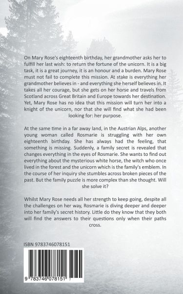 On Mary Rose's eighteenth birthday, her grandmother asks her to fulfill her last wish: to return the fortune of the unicorn. It is a big task, it is a great journey, it is an honour and a burden. Mary Rose must not fail to complete this mission. At stake is everything her grandmother believes in - and everything she herself believes in. It takes all her courage, but she gets on her horse and travels from Scotland across Great Britain and Europe towards her destination. Yet, Mary Rose has no idea that this mission will turn her into a knight of the unicorn, nor that she will find what she had been looking for: her purpose.At the same time in a far away land, in the Austrian Alps, another young woman called Rosmarie is struggling with her own eighteenth birthday. She has always had the feeling, that something is missing. Suddenly, a family secret is revealed that changes everything in the eyes of Rosmarie. She wants to find out everything about the mysterious white horse, the witchwho once lived in the forest and the unicorn which is the family's emblem. In the course of her inquiry she stumbles across broken pieces of the past. But the family puzzle is more complex than she thought. Will she solve it?Whilst Mary Rose needs all her strength to keep going, despite all the challenges on her way, Rosmarie is diving deeper and deeper into her family's secret history. Little do they know that they both will find the answers to their questions only when their paths cross.