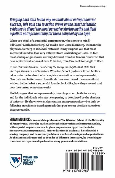 "When you think of a successful entrepreneur, who comes to mind? Bill Gates? Mark Zuckerberg? Or maybe even Jesse Eisenberg, the man who played Zuckerberg in The Social Network? It may surprise you that most successful founders look very different from Zuckerberg or Gates. In fact, most startup origin stories are very different from the famous "unicorns" that have achieved valuations of over $1 billion, from Facebook to Google to Uber. In The Unicorn's Shadow: Combating the Dangerous Myths that Hold Back Startups, Founders, and Investors, Wharton School professor Ethan Mollick takes us to the forefront of an empirical revolution in entrepreneurship. New data and better research methods have overturned the conventional wisdom behind what a successful founder looks like, how they succeed, and how the startup ecosystem works."--