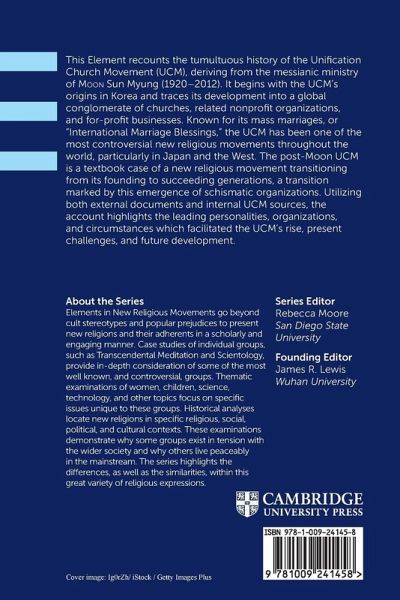 This Element recounts the tumultuous history of the Unification Church Movement. The account highlights the leading personalities, organizations, and circumstances which facilitated the UCM's rise, its present challenges, and future development.