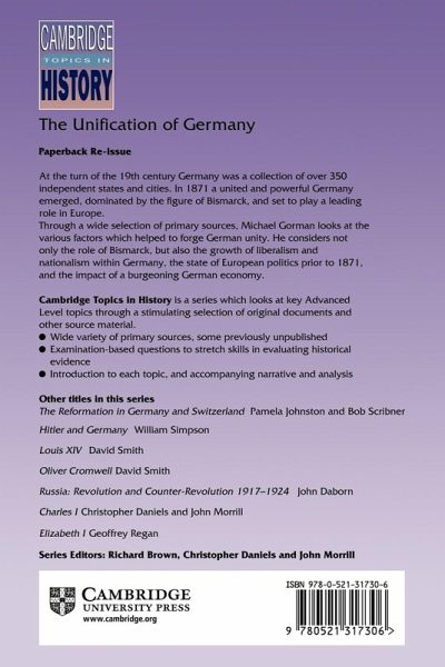 During the nineteenth century a powerful and unified Germany emerged from a collection of over 350 independent states and cities. Gorman uses a wide range of primary sources to look at the role of Bismarck in this transformation. This successful volume in the Cambridge Topics in History series is reprinted with a full colour cover.