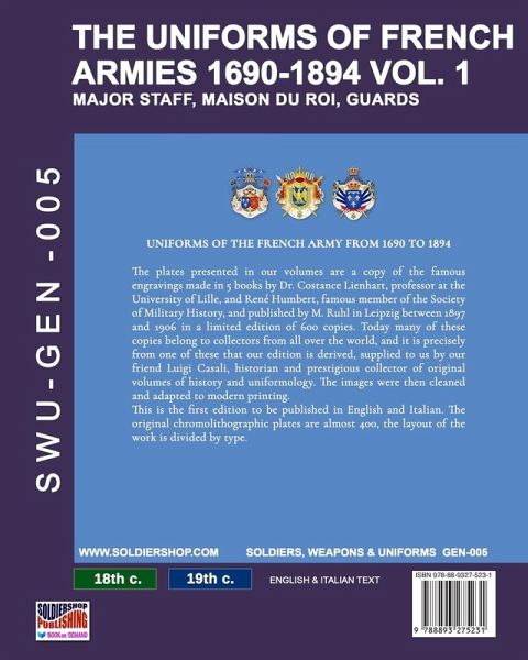 The plates presented in our volumes are a copy of the famous engravings made in 5 books by Dr. Costance Lienhart, professor at the University of Lille, and René Humbert, famous member of the Society of Military History, and published by M. Ruhl in Leipzig between 1897 and 1906 in a limited edition of 600 copies. Today many of these copies belong to collectors from all over the world, and it is precisely from one of these that our edition is derived, supplied to us by our friend Luigi Casali, historian and prestigious collector of original volumes of history and uniformology. The images were then cleaned and adapted to modern printing. This is the first edition to be published in English and Italian. The original chromolithographic plates are almost 400, the layout of the work is divided by type.