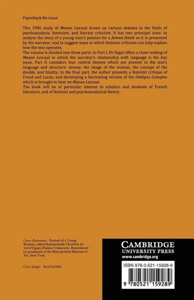 This 1986 study of Manon Lescaut draws on various debates in the fields of psychoanalysis, feminism and literary criticism. It has two principal aims: to analyse this story of a young man's passion for a femme fatale as it is presented by the narrator; and to suggest ways in which feminist criticism can help explain how the text operates. The volume is in three parts. In Part I, Dr Segal offers a close reading of Manon Lescaut in which the narrator's relationship with language is the key issue. Part II considers four central themes which are present in the text's language and structure: money, the image of the woman, the concept of the double, and fatality. In the final part the author presents a feminist critique of Freud and Lacan, and develops thereby a fascinating version of the Oedipus Complex which is brought to bear on Manon Lescaut.