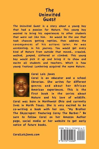 The Uninvited Guest is a story about a young boy that had a passion for Nature. This young boy wanted to bring his experiences to other students that were not like him. He would be the one that took chances getting reptiles, then address the consequences of his actions later. However he continued his journey, he was unrelenting. You would get every kind of Nature from outside that moved, crawled, walked, jumped, slithered, or climbed. This young boy would pick it up and bring it to show and excite all guests. Which is how young Ynotsnai Lumbering acquired the name Nature.