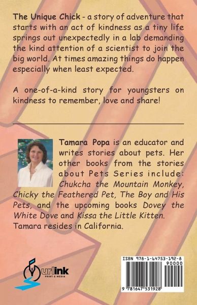 The Unique Chick - a story of adventure that starts with an act of kindness as a tiny life springs out unexpectedly in a lab demanding the kind attention of a scientist to join the big world. At times amazing things do happen especially when least expected. A one-of-a-kind story for youngsters on kindness to remember, love and share! Tamara Popa is an educator and writes stories about pets. Her other books from the stories about Pets Series include: Chukcha the Mountain Monkey, Chicky the Feathered Pet, The Boy and His Pets, and the upcoming books Dovey the White Dove and Kissa the Little Kitten. Tamara resides in California.