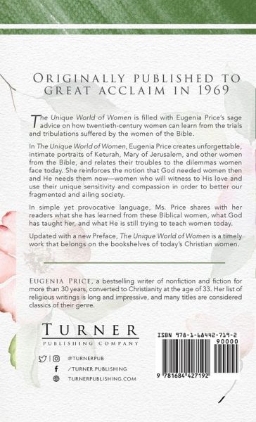 Originally published to great acclaim in 1969 The Unique World of Women is filled with Eugenia Price's sage advice on how twentieth-century women can learn from the trials and tribulations suffered by the women of the Bible. In The Unique World of Women, Eugenia Price creates unforgettable, intimate portraits of Keturah, Mary of Jerusalem, and other women from the Bible, and relates their troubles to the dilemmas women face today. She reinforces the notion that God needed women then and He needs them now-women who will witness to His love and use their unique sensitivity and compassion in order to better our fragmented and ailing society. In simple yet provocative language, Ms. Price shares with her readers what she has learned from these Biblical women, what God has taught her, and what He is still trying to teach women today. Updated with a new Preface, The Unique World of Women is a timely work that belongs on the bookshelves of today’s Christian women.