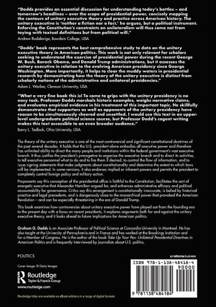 The theory of the unitary executive is one of the most controversial and significant constitutional doctrines of the past several decades. It holds that the U.S. president alone embodies all executive power and therefore has unlimited ability to direct the many people and institutions within the federal government's vast executive branch. It thus justifies the president's prerogative to organize the executive branch and to direct its activities, to tell executive personnel what to do and to fire them if desired, to control the flow of information, and to issue signing statements that make judgments about constitutionality and determine the extent to which laws will be implemented. In some versions, it also endorses implied or inherent powers and permits the president to completely control foreign policy and military action. Proponents say this conception of the presidential office is faithful to the Constitution, facilitates the sort of energetic executive that Alexander Hamilton argued for, and enhances administrative efficacy and political accountability for governance. Critics say this arrangement is constitutionally inaccurate, is belied by historical practice and legal precedents, and is dangerously close to the monarchical power that provoked the American Revolution - and can be especially threatening in the era of Donald Trump. This book examines how controversies about unitary executive power have played out from the founding era to the present day with a focus on recent presidents, it explores arguments both for and against the unitary executive theory, and it looks ahead to future implications for American politics.
