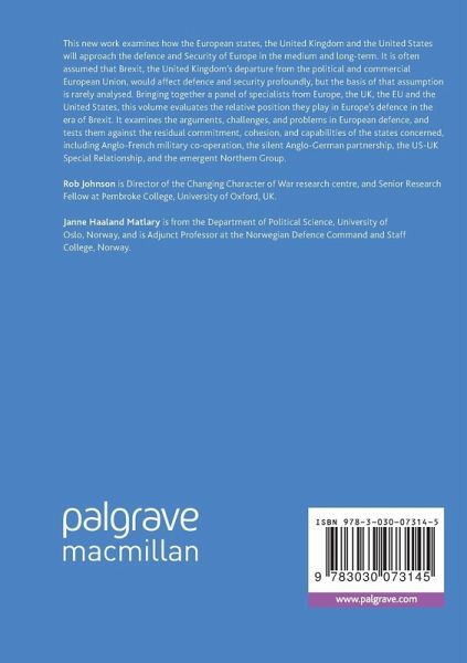 This new work examines how the European states, the United Kingdom and the United States will approach the defence and Security of Europe in the medium and long-term. It is often assumed that Brexit, the United Kingdom's departure from the political and commercial European Union, would affect defence and security profoundly, but the basis of that assumption is rarely analysed. Bringing together a panel of specialists from Europe, the UK, the EU, and the United States, this volume evaluates the relative position they play in Europe's defence in the era of Brexit. It examines the arguments, challenges, and problems in European defence, and tests them against the residual commitment, cohesion, and capabilities of the states concerned, including Anglo-French military co-operation, the silent Anglo-German partnership, the US-UK Special Relationship, and the emergent Northern Group.