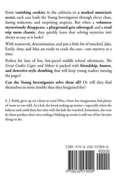 From vanishing cookies in the cafeteria to a masked musician's secret, each case leads the Young Investigators through clever clues, daring stakeouts, and surprising suspects. But when a volunteer mysteriously disappears, a playground gets sabotaged, and a road trip turns chaotic, they quickly learn that solving mysteries isn't always as easy as it looks! With teamwork, determination, and just a little bit of mischief, Jake, Emily, Amy, and Max are ready to crack the case-one mystery at a time. Perfect for fans of fun, fast-paced middle school adventures, The Great Cookie Caper and Others is packed with friendship, humor, and detective-style sleuthing that will keep young readers turning the pages! Can the Young Investigators solve them all? Or will they find themselves in more trouble than they bargained for?