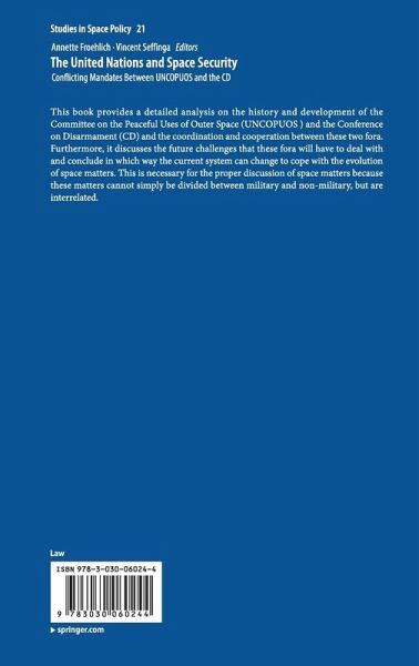 This book provides a detailed analysis on the history and development of the Committee on the Peaceful Uses of Outer Space (UNCOPUOS) and the Conference on Disarmament (CD) and the coordination and cooperation between these two fora. Furthermore, it discusses the future challenges that these fora will have to deal with and conclude in which way the current system can change to cope with the evolution of space matters. This is necessary for the proper discussion of space matters because these matters cannot simply be divided between military and non-military, but are interrelated.