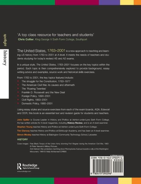 In a unique style, The United States, 1763-2001 focuses on the key topics within the period. Each topic is then comprehensively explored to provide background, essay writing advice and examples, source work and historical skills exercises.