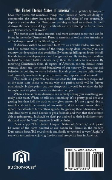 "The United Utopian States of America" is a politically inspired book that points out numerous things that liberals in power are doing to compromise the safety, independence, and well being of our country. It depicts a nation that the liberals are working so hard to achieve. It then destroys the concepts and logic the liberals use in an attempt to further their push towards "a perfect world." The author uses humor, sarcasm, and more common sense than can be found in the entire Democratic Party, to entertain as well as alert Americans of the danger posed by the liberal agenda. If America wishes to continue to thrive as a world leader, Americans need to become more aware of the things being done internally in our country that jeopardize that possibility. By banning drilling on domestic soil, liberals insure our dependence on foreign nations. By forcing our soldiers to fight "sensitive" battles liberals deny them the ability to win wars. By removing Christianity from all aspects of American society, liberals insure eventual chaos and the moral breakdown of our country. By excusing bad behavior by pointing to worse behavior, liberals prove they are unfit leaders and miserably unable to keep our nation strong, respected and admired. This book is a great way to look at what the left considers utopia and at the same time shows us exactly why the perfect world will be forever unattainable. It also points out how dangerous it would be to allow the left to implement it's plan to create an American utopia. When a liberal makes demands he's actually selling you something you really don't want. When he tells you something, it's a pretty good bet your getting less than half the truth on any given matter. It's not a good idea to trust liberals with the security of our nation and it's an even worse idea to ignore their efforts to further their agenda. By ignoring their ridiculous claims and ideas, we've allowed liberals to get a foothold and with that they've been able to gain ground. In fact, if we don't put and end to their foolishness soon this land won't be "ours" anymore. It will be theirs. Please enjoy "The United Utopian States of America," and please be aware of the harm directed at our nation by liberals in the modern Democratic Party. Tell your friends and family to vote and to vote "Right" if you wish to continue enjoying freedom and prosperity here in America.