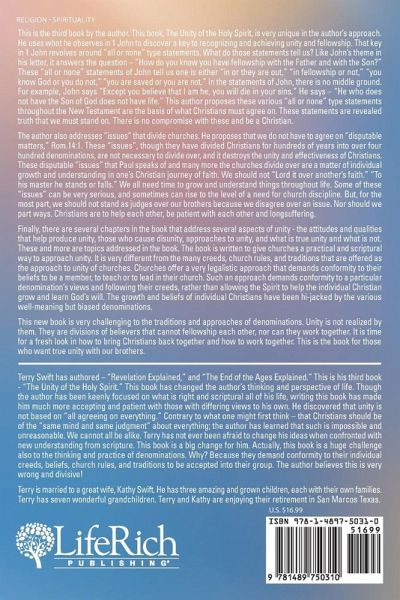 This is the third book by the author. This book, The Unity of the Holy Spirit, is very unique in the author's approach. He uses what he observes in 1 John to discover a key to recognizing and achieving unity and fellowship. That key in 1 John revolves around "all or none" type statements. What do those statements tell us? Like John's theme in his letter, it answers the question - "How do you know you have fellowship with the Father and with the Son?" These "all or none" statements of John tell us one is either "in or they are out," "in fellowship or not," "you know God or you do not," "you are saved or you are not." In the statements of John, there is no middle ground. For example, John says "Except you believe that I am he, you will die in your sins." He says - "He who does not have the Son of God does not have life." This author proposes these various "all or none" type statements throughout the New Testament are the basis of what Christians must agree on. These statements are revealed truth that we must stand on. There is no compromise with these and be a Christian. The author also addresses "issues" that divide churches. He proposes that we do not have to agree on "disputable matters," Rom.14:1. These "issues", though they have divided Christians for hundreds of years into over four hundred denominations, are not necessary to divide over, and it destroys the unity and effectiveness of Christians. These disputable "issues" that Paul speaks of and many more the churches divide over are a matter of individual growth and understanding in one's Christian journey of faith. We should not "Lord it over another's faith." "To his master he stands or falls." We all need time to grow and understand things throughout life. Some of these "issues" can be very serious, and sometimes can rise to the level of a need for church discipline. But, for the most part, we should not stand as judges over our brothers because we disagree over an issue. Nor should we part ways. Christians are to help each other, be patient with each other and longsuffering. Finally, there are several chapters in the book that address several aspects of unity - the attitudes and qualities that help produce unity, those who cause disunity, approaches to unity, and what is true unity and what is not. These and more are topics addressed in the book. The book is written to give churches a practical and scriptural way to approach unity. It is very different from the many creeds, church rules, and traditions that are offered as the approach to unity of churches. Churches offer a very legalistic approach that demands conformity to their beliefs to be a member, to teach or to lead in their church. Such an approach demands conformity to a particular denomination's views and following their creeds, rather than allowing the Spirit to help the individual Christian grow and learn God's will. The growth and beliefs of individual Christians have been hi-jacked by the various well-meaning but biased denominations. This new book is very challenging to the traditions and approaches of denominations. Unity is not realized by them. They are divisions of believers that cannot fellowship each other, nor can they work together. It is time for a fresh look in how to bring Christians back together and how to work together. This is the book for those who want true unity with our brothers.