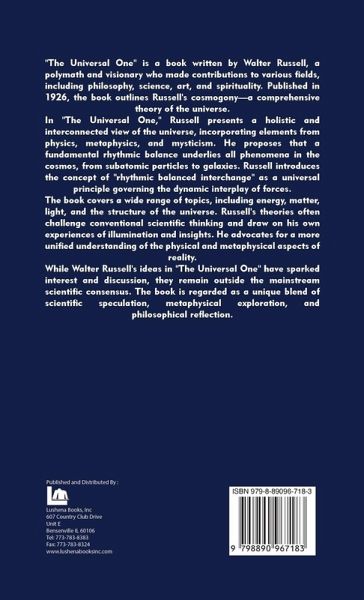 The Universal One is Walter Russell's first expression of his new Cosmology explaining the Mind-centered electric universe. Though he would revise his theory somewhat over the years, this is the first and basic description of his new Cosmology. Lavishing illustrated, it sets out his views on God, the Universe, matter and Man's place in the world as he searches for a path to god. In this 1926 historic volume, Walter Russell first reveals the possibility of transmutation of the elements. This illustrated treatise is Russell's scientific explanation of God's ways and processes in the construction of the Universe and provides a guide for illuminating Man's proper way of living during the long journey to the Light of God. Contents: Part I: Creation; The Life Principle; Mind, The One Universal Substance; Thinking Mind; The Process of Thinking; Thinking Registered in Matter; Concerning Appearances; The Sex Principle; Sex Opposites of Light; The Reproductive Principle; Energy Transmission; A Finite Universe; A Dimensionless Universe; Concerning Dimension; The Formula of Locked Potentials; Universal Oneness; Omnipresence; Omnipotence; Omniscience. Part II: Dynamics of Mind & Light Units of Matter; Electricity and Magnetism; New Concepts of Electricity and Magnetism; Electricity; The Elements of Matter; The Octave Cycle of the Elements of Matter; The Instability and the Illusion of Stability of Matter; The Universal Pulse; Concerning Energy; Electro-Magnetic Pressure; Attraction and Repulsion; Gravitation and Radiation; Expressions of Gravitation and Radiation - Universal Direction; Universal Mathematics & Ratios; Charging & Discharging Poles; The Wave; Time; Temperature; Color; Universal Mechanics; Rotation; Revolution; Crystallization; Plane and Ecliptic; Ionization; Valence; Tone; Conclusion; New Laws an