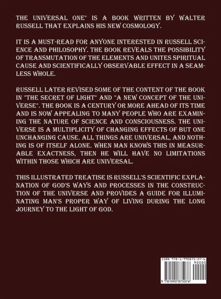 The Universal One" is a book written by Walter Russell that explains his new Cosmology. It is a must-read for anyone interested in Russell science and philosophy. The book reveals the possibility of transmutation of the elements and unites spiritual cause and scientifically observable effect in a seamless whole. Russell later revised some of the content of the book in "The Secret of Light" and "A New Concept of the Universe". The book is a century or more ahead of its time and is now appealing to many people who are examining the nature of science and consciousness. The universe is a multiplicity of changing effects of but one unchanging cause. All things are universal, and nothing is of itself alone. When man knows this in measurable exactness, then he will have no limitations within those which are universal. The Universal One is Walter Russell's first expression of his new Cosmology explaining the Mind-centered electric universe. Though he would revise his theory somewhat over the years, this is the first and basic description of his new Cosmology. Lavishing illustrated, it sets out his views on God, the Universe, matter and Man's place in the world as he searches for a path to god. In this historic volume, Walter Russell first reveals the possibility of transmutation of the elements. This illustrated treatise is Russell's scientific explanation of God's ways and processes in the construction of the Universe and provides a guide for illuminating Man's proper way of living during the long journey to the Light of God.
