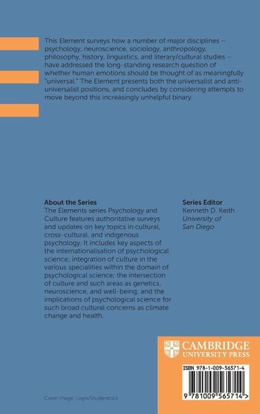 Not supplied by the author. This Element surveys how a number of major disciplines ¿ psychology, neuroscience, sociology, anthropology, philosophy, history, linguistics, and literary/cultural studies ¿ have addressed the long-standing research question of whether human emotions should be thought of as meaningfully 'universal.' The Element presents both the universalist and anti-universalist positions, and concludes by considering attempts to move beyond this increasingly unhelpful binary.