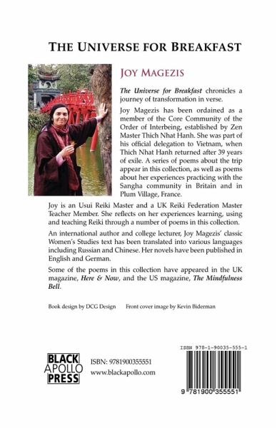 The Universe for Breakfast chronicles a journey of transformation in verse. Joy Magezis has been ordained as a member of the Core Community of the Order of Interbeing, established by Zen Master, Thich Nhat Hanh. She was part of his official delegation to Vietnam, when Thich Nhat Hanh returned after 39 years of exile. A series of poems about the trip appear in this collection, as well as poems about her experiences practicing with the Sangha community in Britain and in Plum Village. Joy is an Usui Reiki Master and a UK Reiki Federation Master Teacher Member. She documents her experiences learning, using and teaching Reiki through a number of poems in this book. An international author and college lecturer, Joy's classic Women's Studies text has been translated into various languages including Russian and Chinese. Her novels have been published in both English and German