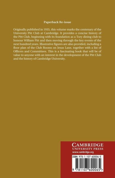 Originally published in 1935, this volume marks the centenary of the University Pitt Club at Cambridge. It provides a concise history of the Pitt Club, beginning with its foundation as a Tory dining club to honour William Pitt and then moving through the key events of the next hundred years. Illustrative figures are also provided, including a floor plan of the Club Rooms on Jesus Lane, together with a list of Officers and Committees. This is a fascinating book that will be of value to anyone with an interest in the development of the Pitt Club and the history of Cambridge University.