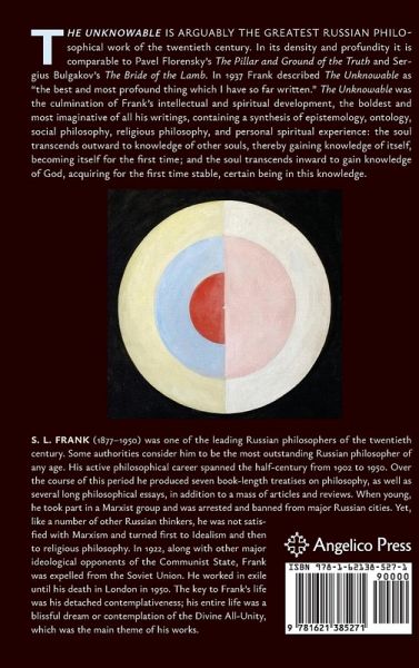 The Unknowable is arguably the greatest Russian philosophical work of the twentieth century. In its density and profundity it is comparable to Pavel Florensky’s The Pillar and Ground of the Truth and Sergius Bulgakov’s The Bride of the Lamb. In 1937 Frank described The Unknowable as "the best and most profound thing which I have so far written." The Unknowable was the culmination of Frank’s intellectual and spiritual development, the boldest and most imaginative of all his writings, containing a synthesis of epistemology, ontology, social philosophy, religious philosophy, and personal spiritual experience: the soul transcends outward to knowledge of other souls, thereby gaining knowledge of itself, becoming itself for the first time; and the soul transcends inward to gain knowledge of God, acquiring for the first time stable, certain being in this knowledge.