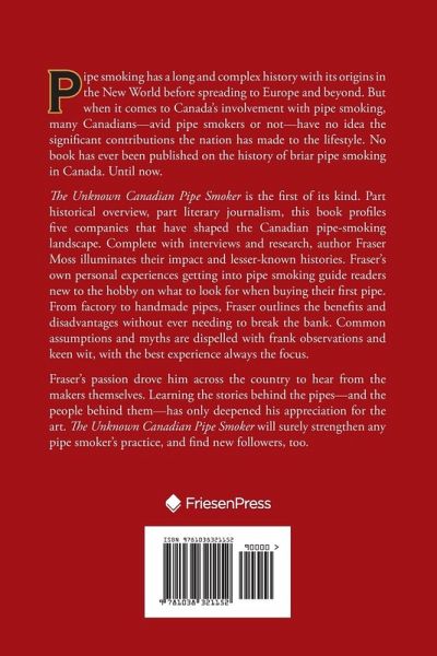 Pipe smoking has a long and complex history with its origins in the New World before spreading to Europe and beyond. But when it comes to Canada's involvement with pipe smoking, many Canadians-avid pipe smokers or not-have no idea the significant contributions the nation has made to the lifestyle. No book has ever been published on the history of briar pipe smoking in Canada. Until now. The Unknown Canadian Pipe Smoker is the first of its kind. Part historical overview, part literary journalism, this book profiles five companies that have shaped the Canadian pipe-smoking landscape. Complete with interviews and research, author Fraser Moss illuminates their impact and lesser-known histories. Fraser's own personal experiences getting into pipe smoking guide readers new to the hobby on what to look for when buying their first pipe. From factory to handmade pipes, Fraser outlines the benefits and disadvantages without ever needing to break the bank. Common assumptions and myths are dispelled with frank observations and keen wit, with the best experience always the focus. Fraser's passion drove him across the country to hear from the makers themselves. Learning the stories behind the pipes-and the people behind them-has only deepened his appreciation for the art. The Unknown Canadian Pipe Smoker will surely strengthen any pipe smoker's practice, and find new followers, too.