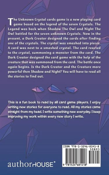 The Unknown Crystal cards game is a new playing card game based on the legend of the seven crystals. The legend was back when Shadow the Owl and Night the Owl battled for the seven unknown crystals. Now in the present, the Dark Creator designed the cards after finding one of the crystals. The crystal was smashed into pieces. A card was next to a smashed crystal. The card reacted to the crystal, summoning a monster from the card. The Dark Creator designed the card game with the help of the creature that was summoned from the card. The battle once again begins. Are the Dark Creator and the creature more powerful than Shadow and Night? You will have to read all the stories to find out.