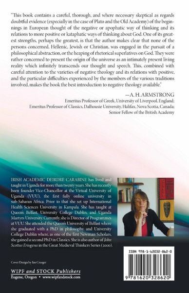 ""This book contains a careful, thorough, and where necessary skeptical as regards doubtful evidence (especially in the case of Plato and the Old Academy) of the beginnings in European thought of the negative or apophatic way of thinking and its relations to more positive or kataphatic ways of thinking about God. One of its greatest strengths, perhaps the greatest, is that the author makes clear that none of the persons concerned, Hellenic, Jewish or Christian, was engaged in the pursuit of a philosophical abstraction, or the heaping of rhetorical superlatives on God. They were rather concerned to present the origin of the universe as an intimately present living reality which infinitely transcends our thought and speech. This, combined with careful attention to the varieties of negative theology and its relations with positive, and the particular difficulties experienced by the members of the various traditions involved, makes the book the best introduction to the negative theology available."" -A. H. Armstrong, Emeritus Professor of Greek, University of Liverpool, England. Emeritus Professor of Classics, Dalhousie University, Halifax, Nova Scotia, Canada. Senior Fellow of the British Academy. Irish academic Deirdre Carabine has lived and taught in Uganda for more than twenty years. She has recently been founder Vice-Chancellor at the Virtual University of Uganda (VUU), the first fully online university in Sub-Saharan Africa. Prior to that she set up International Health Sciences University in Kampala. She has taught at Queen's Belfast, University College Dublin, and Uganda Martyrs University. Currently, she is Director of Programmes at VUU. She attended the Queen's University of Belfast where she graduated with a PhD in philosophy, and University College Dublin where, as one of the first Newman Scholars, she gained a second PhD in Classics. She is also author of John Scottus Eriugena in the Great Medieval Thinkers Series (2000).
