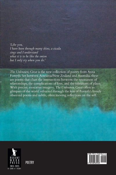 The Unknown, Great is the new collection of poetry from Anna Forsyth. Set between Aotearoa/New Zealand and Australia, these are poems that chart the intersections between the resonances of relationships, the complications of love, and the vibrations of place. With precise, evocative imagery, The Unknown, Great offers us glimpses of the world refracted through the lens of Forsyth's keenly observed poems and subtle, often moving reflections on the self.