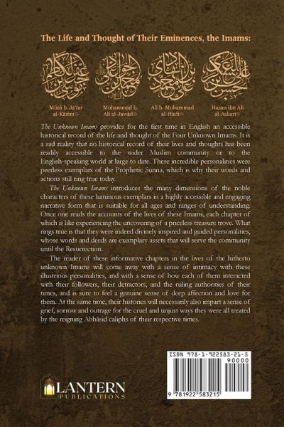 The Unknown Imams provides for the first time in English an accessible historical record of the life and thought of the Four Unknown Imams. It is a sad reality that no historical record of their lives and thoughts has been readily accessible to the wider Muslim community or to the English-speaking world at large to date. These incredible personalities were peerless exemplars of the Prophetic Sunna, which is why their words and actions still ring true today. The Unknown Imams introduces the many dimensions of the noble characters of these luminous exemplars in a highly accessible and engaging narrative form that is suitable for all ages and ranges of understanding. Once one reads the accounts of the lives of these Imams, each chapter of which is like experiencing the uncovering of a priceless treasure trove. What rings true is that they were indeed divinely inspired and guided personalities, whose words and deeds are exemplary assets that will serve the community until the Resurrection. The reader of these informative chapters in the lives of the hitherto unknown Imams will come away with a sense of intimacy with these illustrious personalities, and with a sense of how each of them interacted with their followers, their detractors, and the ruling authorities of their times, and is sure to feel a genuine sense of deep affection and love for them. At the same time, their histories will necessarily also impart a sense of grief, sorrow and outrage for the cruel and unjust ways they were all treated by the reigning Abbāsid caliphs of their respective times.